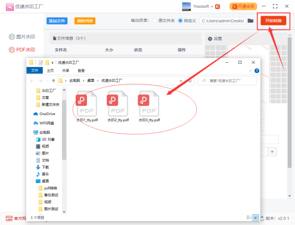 步骤4,设置好后就点击上方的【开始转换】按钮,启动软件程序,当软件处理完成后会自动打开一个文件夹,所有添加水印后的PDF文件会全部保存到这里。