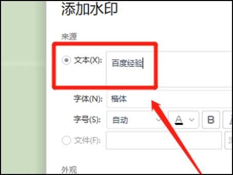 在添加【水印】页面中,将会出现新的窗口,文本框输入水印内容,设置完善字体、颜色及透明度等,直至预览效果满意。