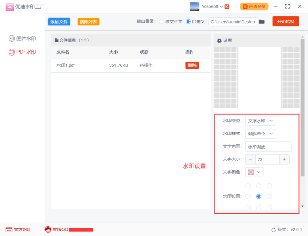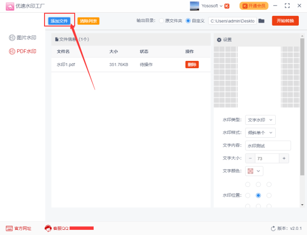 步骤2,添加好pdf文件后就可以进行设置了,水印类型选择“文字水印”;然后选择水印样式,一共四种:单个、倾斜单个、平铺、倾斜平铺,每个都试一试,看看适合哪种;最后输入水印文字,设置文字的大小/颜色和透明度/位置等。上面可以实时预览水印的样子,及时调整。