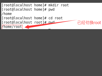 4、在此目录下新建目录文件夹root,命令如下:mkdir root,查看下目录路径pwd,还是在/home目录下,切换到root(就是刚才创建的目录),用cd root命令。