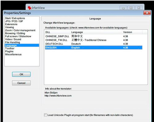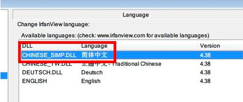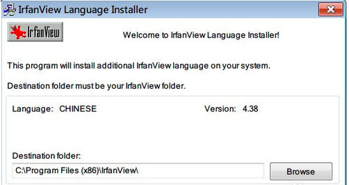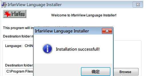 下载“语言文件”(language file),双击运行【irfanview_lang_chinese.exe】,选择【目标文件夹】(Destination folder),点击【安装】(Install),提示“Installation successful”(安装成功),点击“确定”,再打开 IrfanView,选择【Options】->【Change Language...】,出现【Properties/Settings】对话框,选择【简体中文】,点击左侧的【OK】按钮。