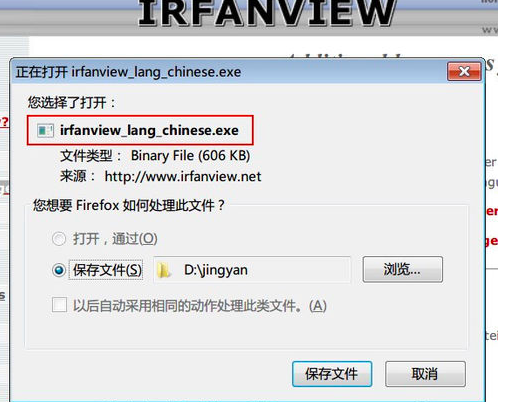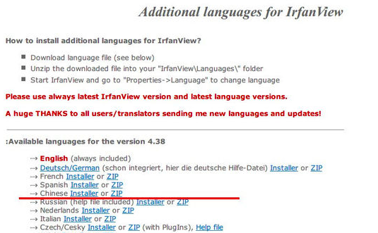 先下载“语言文件”(language file),我们这里要下载的是我们的母语——汉语——的语言文件。有两种格式可供选择,Chinese Installer or ZIP (Installer 就是 exe 格式的文件,下载后可以直接运行,而 ZIP 呢,需要解压),我们这里下载 Installer(即【irfanview_lang_chinese.exe文件】)。