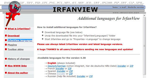 我们先百度“IrfanView”,找到官方网站,点击左侧的“IrfanView languages”,在这里,就可以找到语言相关文件下载: