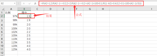 =IF(A2=1,2,IF(A2-1>=0.2,2+2,IF(A2-1>=0,2+(A2-1)*100*0.1,IF((1-A2)>0.4,0,2+0.1*100*(A2-1)/3))))