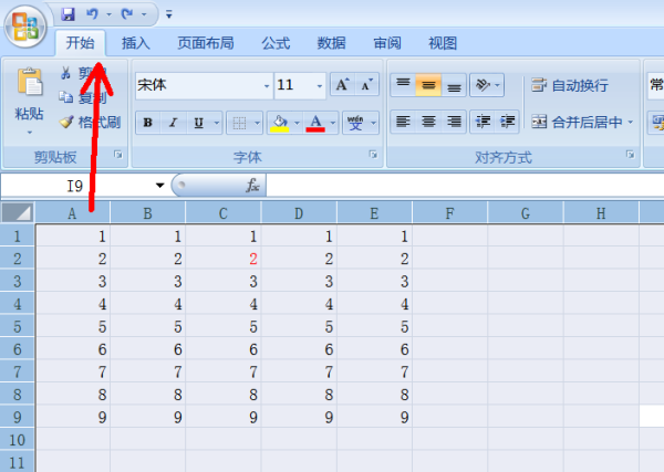 2、如果下面输入同样的数值还是会显示为红色就说明设置了规则,此时应全选所有内容,然后在上方的工具栏处选择【开始】。