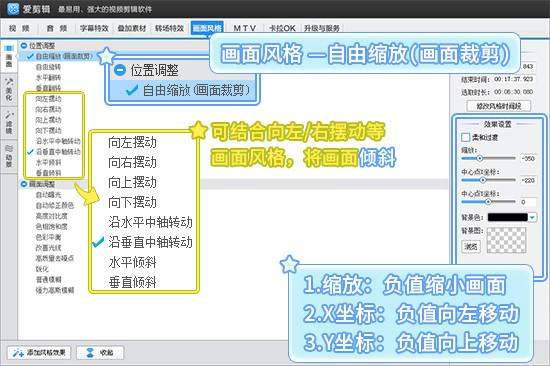 在电脑端打开爱剪辑,导入视频。在“画面风格”面板下,点击左侧的“画面”,并勾选“沿垂直中轴转动”,在右侧修改参数设置。