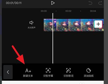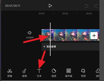 3、接着在打开的编辑页面中,移动时间轴确定位置后,点击“文本”。