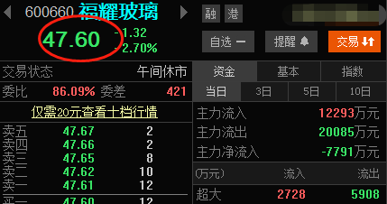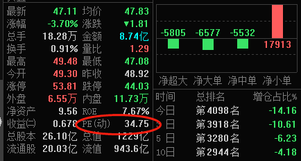 ②PEG:从盘口信息可以看到福耀玻璃的PE为34.75,再根据公司研报获取到净利润收益率83.5%,可以得到PEG=34.5/(83.5%*100)=约0.41