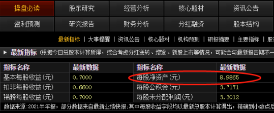 ③市净率:首先打开炒股软件按F10获取每股净资产,结合股价可以得到市净率= 47.6 / 8.9865 =约5.29
