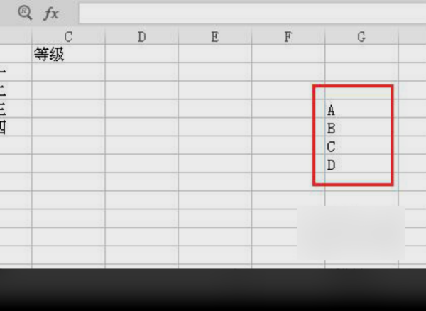 2、然后找到一出空白列,输入所要填写的四个等级(A/B/C/D),如果有需要,可以将四个字母隐藏。