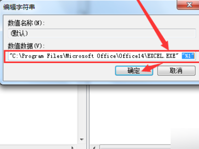 6、点击command ,双击右边的“默认”,在弹出窗口中,把原来的"C:\Program Files\……\EXCEL.EXE" xxxx 中的后缀xxxx 改为 "%1",这时打开EXCEL就可以了。