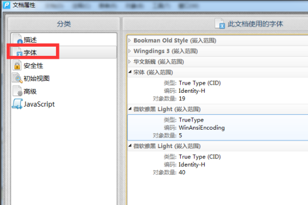 1. 使用任何PDf编辑工具打开要处理的PDf文档。在“文件”-“文档属性”界面,切换到“字体”选项卡,可以看到当前PDf文档所需的字体类型。