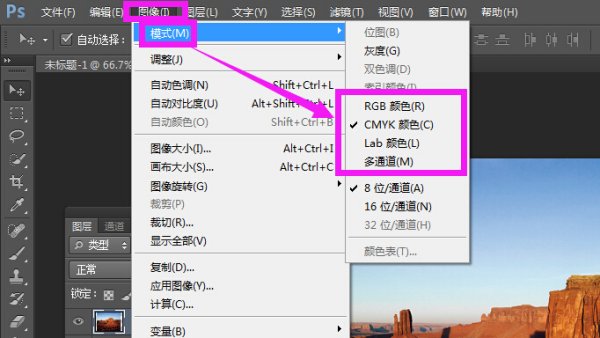 在打开的PS模板文件中,点击“图像”,选择“模式”,在展开的列表里就可以看到当前文件的颜色模式了;