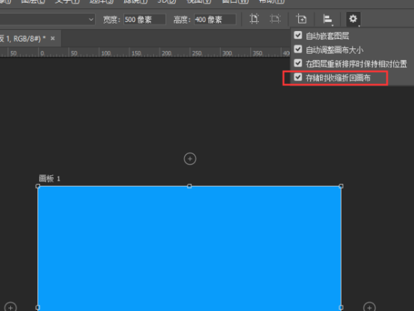 5、选择画板工具,选中画板,在上方工具栏勾上“存储时收缩折回画布”前面的勾;