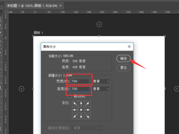 2、按快捷键“Ctrl+Alt+C”调出画布面板,把画布大小设为700像素*700像素,点击确定;