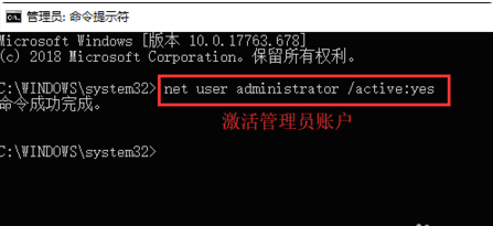 2、打开命令提示符后,输入:netuseradministrator/active:yes 然后回车。之后就可以看到命令成功完成的提示。