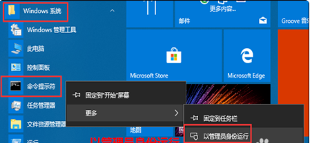 1、单击开始菜单,找到“Windows系统”里面的“命令提示符”,右键单击选择“更多”,在更多的选项里面,点击“以管理员身份运行”