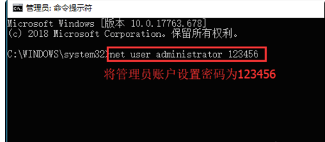 3、可以通过输入:netuseradministrator 123456 命令为管理员设置一个密码,123456可以是其他数字和字母组合密码。
