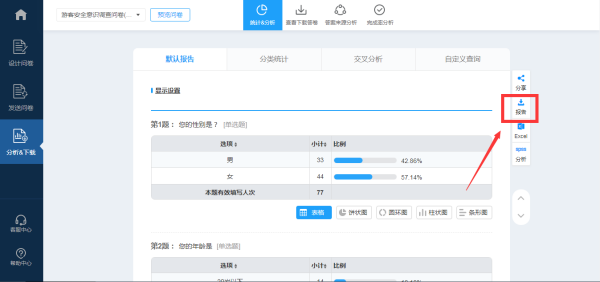 5、之后,系统会自动跳转到该问卷的结果分析界面,在该界面可以看到问卷里每个问题的分析统计数据,如果想要下载该数据,则点击右侧的“报告”程序选项即可。