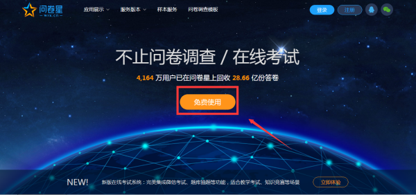 2、之后,系统会自动跳转到“问卷星”的官网界面,找到该网址界面的“免费试用”程序选项,点击进入“免费试用”程序选项。