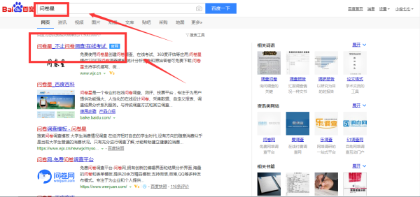 1、首先,打开电脑的百度浏览器,然后在打开的百度搜索框内输入“问卷星”,然后点击键盘的回车键,之后系统会自动跳转到“问卷星”的搜索列表页面,找到“问卷星”的官网,点击进入“问卷星”的官方网站。
