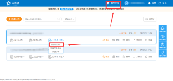 4、成功登录之后系统会自动跳转到问卷星的个人界面,点击我的问卷程序选项,然后找到想要查看结果的问卷,点击该问卷对应的“分析&下载”程序选项,然后在打开的下拉列表里找到“统计&分析”程序选项,点击进入该选项。