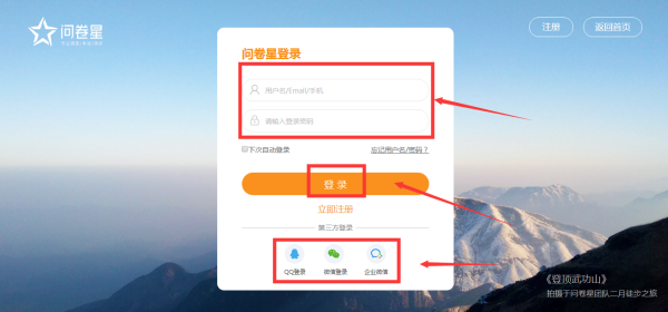 3、之后,系统会自动跳转到问卷星的登录界面,可以采用问卷星的账号登录,如果没有问卷星账号,可以选择QQ登录、微信登录和企业账号登录的方式登入问卷星网址。这里举例QQ登录方式,点击QQ登录,然后输入QQ的账号和密码即可成功登录问卷星。
