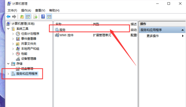 2、打开Win10系统中的管理页面之后,点击页面左侧的【服务和应用程序】,然后双击页面右上方的【服务】菜单;