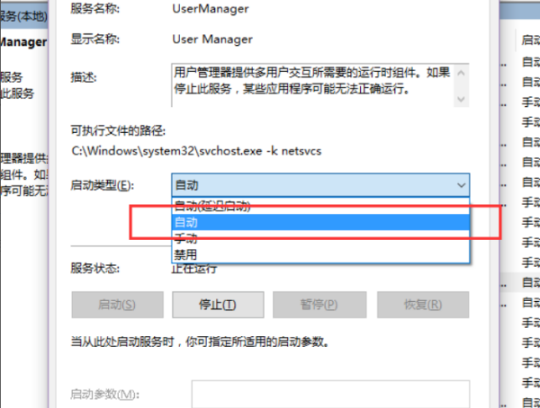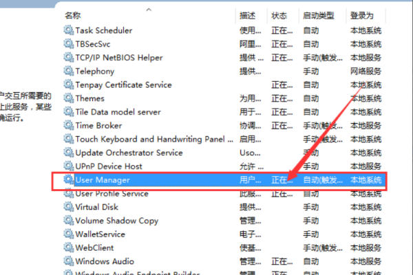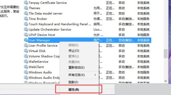 4、在打开Win10系统中的服务组件页面之后,在服务组件页面中找到【User Manager】组件,然后对着该组件击右键,选择【属性】选项;