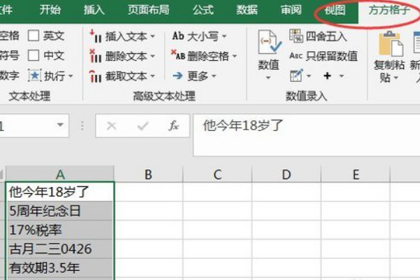 1、选中需要提取数字的无规律的单元格,点击“方方格子”。