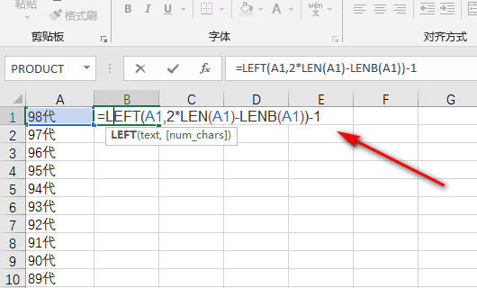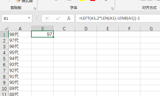 1、打开Excel表格,输入公式=LEFT(A1,2*LEN(A1)-LENB(A1))-1,是要把数字提取出来,-1是代表把提取出来的数字减去1。
