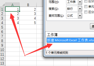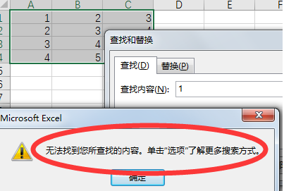 1、首先在excel表格中进行查找操作,可以看到在查找“1”时,页面弹出无法找到内容的提示框。
