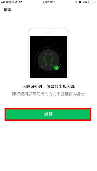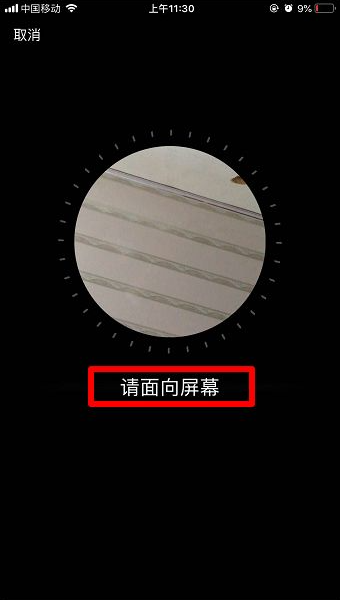 9、然后将脸面向屏幕,在圆圈内,不要太远,会开始进行人脸识别,识别时屏幕会闪烁。
