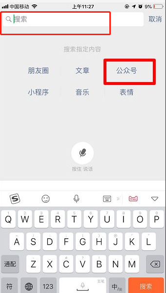 1、打开微信,点击“搜索栏”,点击“公众号”。