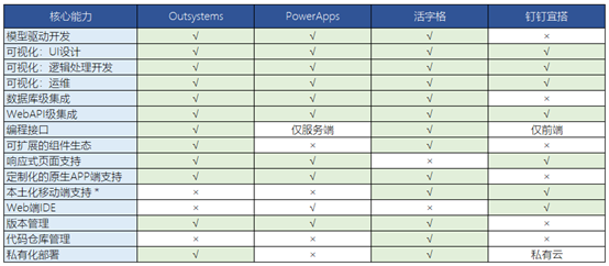 为了直观的展示核心能力体系,我选取了国内外几个典型的低代码开发平台产品(outsystems、powerapps、活字格、钉钉宜搭)进行横评。这里的评价仅为定性,不涉及定量。一家之言,仅供参考。