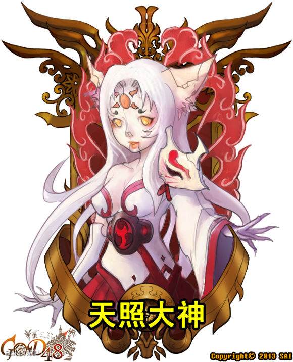 原型背景:日本神话传说中最核心的女神--太阳女神,被奉为日本皇室的祖先,尊为神道教的主神。据《古事记》和《日本书纪》记载,伊奘诺尊在逃离“黄泉国”的归途中,于筑紫橘之小门的阿波岐原洗刷污秽时,洗左眼生出一美丽女神。因女神出生时光辉耀天照地,伊奘诺尊甚喜,将其命名为天照大神,送她八阪琼曲玉,并命其司理高天原(日本诸神所居之处)。招数:天照、炼狱之光