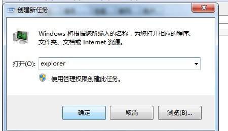 3、在打开的“创建新任务”对话框中输入“explorer”,单击“确定”。