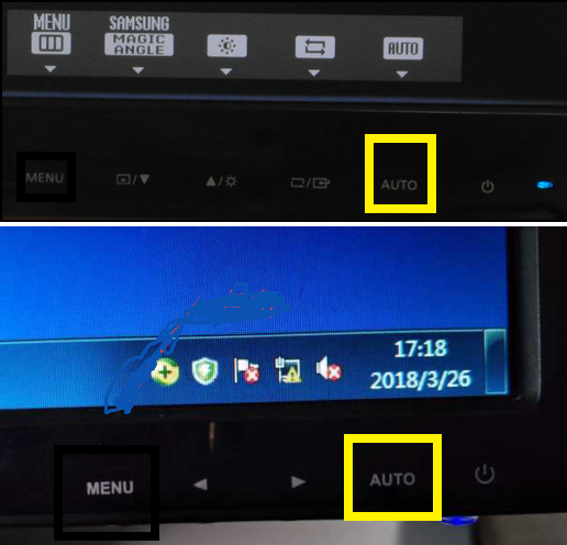 1、现在的显示器一般都有一个自动调节按钮(AUTO),按一下这个按钮就好了。如下图黄框内。