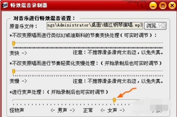 4.在“对音乐进行特效混音设置”选项下有一个“进入变声处理”的,鼠标拖移对应的浮标,如下图,可以调成我们想要的声音,这里我们选择“女声”。如果想试听变声效果可以点击“预览播放”。同时还可以根据个人需要进行节奏变快、轻柔化变慢的处理。