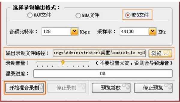 5.选择录制输出格式,这选择了mp3文件,可调音频比特率(128Kbps是mp3标准比特率)、采样率,再设置下输出录制文件的路径,然后点击左上方的“开始混音录制”。