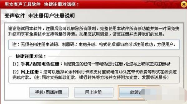 1、打开变声器软件,这里打开的是可录制、混音的变声器,如果打开的是未注册的软件,这时会出现一个对话框,点击“继续使用”。