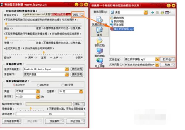 3.如果上一步选择了特效混音录制器,就会进入这样的一个录制窗口,在“原音乐文件”右边“浏览”导入准备变音的音乐文件。我们这里可以导入一个男声的mp3音频。