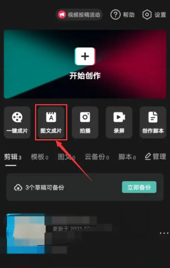1、打开剪映app。在开始创作下面用户们就可以看到新功能【图文成片】。