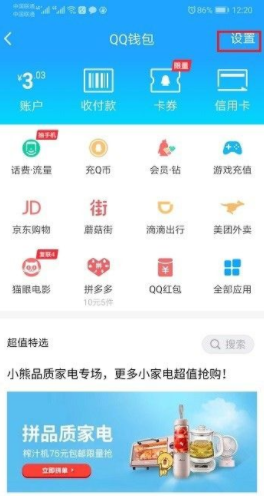 2、进去qq钱包界面,点击右上方的设置。