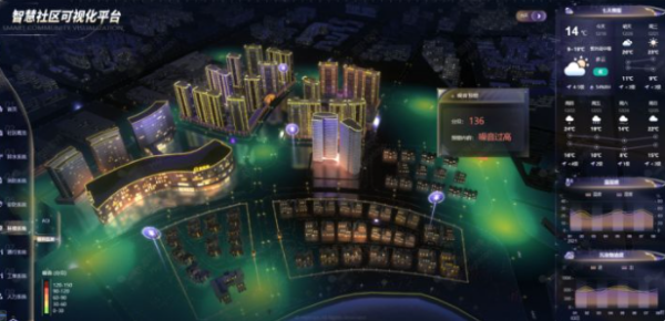 将社区空气质量指数(Air Quality Index ,简称 AQI)、噪音监测情况渲染成热力图的形式进行展示。场景内将根据实时指数变化实现色阶的改变,以表示空气质量或噪音分贝,当指数超出正常范围时,系统会自动触发告警,定位至该区域,输出指数超标信息。三维可视化环境系统监测预警机制,提高了对大范围、碎片化社区的管理效率,更有质量的督促用户快速注意和快速维护。