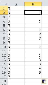 =IF(A2="Y","",IF(A1<>A2,1,B1+1))
