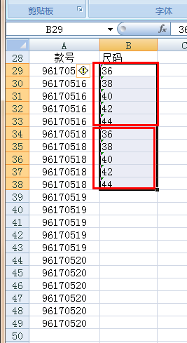 1、先对B列“尺码”输入两组数字(36、38、40、42、44),如图,B29:B33 和 B34:B38、选择B列这两组数据区域B29:B38,下拉,就OK.