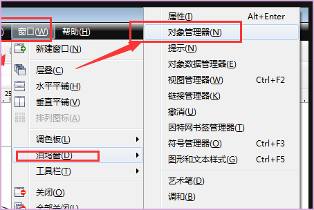 2、然后在弹出来的窗口中点击打开泊坞窗中的“对象管理器”。