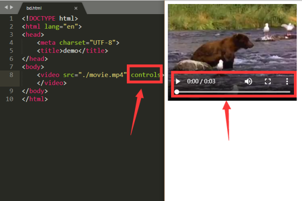 2、此时的视频只会显示一个封面,并没有控制按钮,这时为video标签添加“controls”属性,如图所示,不需要添加属性值,可以看到视频中出现了常用的控制按钮: