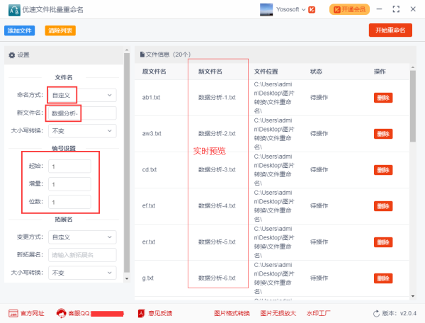 步骤2,接下来是重要的参数设置环节,命名方式选择“自定义”(还有替换和插入功能,看你自己的需求选择);随后在下面方框中输入新的文件名称;然后设置文件的编号(起始值,增量值和位数值);在右边可以实时预览新文件名样式,看符不符合自己的要求。